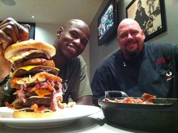 On Saturday, Denver Nuggets player Al Harrington took the Bugsy Challenge at Burger Joint at Flamingo Las Vegas. The Bugsy Challenge consists of a burger with six one-third-pound burger patties, six types of cheese (American, cheddar, pepper jack, fresh house-made mozzarella, Swiss and panko-crusted deep-fried provolone), chorizo, sautéed mushrooms, black and tan onion rings, three strips of applewood smoked bacon, three strips of cayenne peppered bacon and a fried egg, all oozing with Burger Joint’s special pink peppercorn aioli.