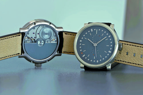 The name started as a joke –Ochs is German for “ox,” a “tongue in cheek way of saying that watchmaking doesn’t always have to be treated too seriously” says the firm’s website. The watches made by Ochs und Junior have that rarest of qualities in watchmaking: a sense of humor. The cases have a deliberate bluntness accented by the stolid lugs, large, easily grasped crown, and the fact that Ochs und Junior deliberately leave machining marks on them, and the customary logoing and decoration of the dial with superfluous verbiage is resolutely absent. The brand, in this case, is literally a brand –the only place the name of the company appears is as a heat applied brand on the inside of the watch strap.