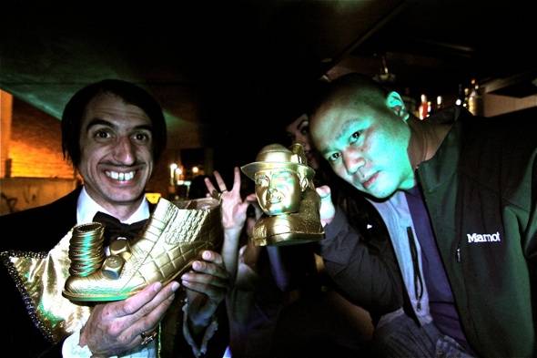 On Friday, April 6, The Gazillionaire and cast of “Absinthe” attended First Friday arts celebration to donate Bar Vendome to the monthly event. At the unveiling at Beauty Bar, Gaz presented Zappos.com founder Tony Hsieh with the first pair of gold shoes ever to be bestowed to another person thus making him the very first member of “The Gazillionaire’s Gold Shoe Club.”