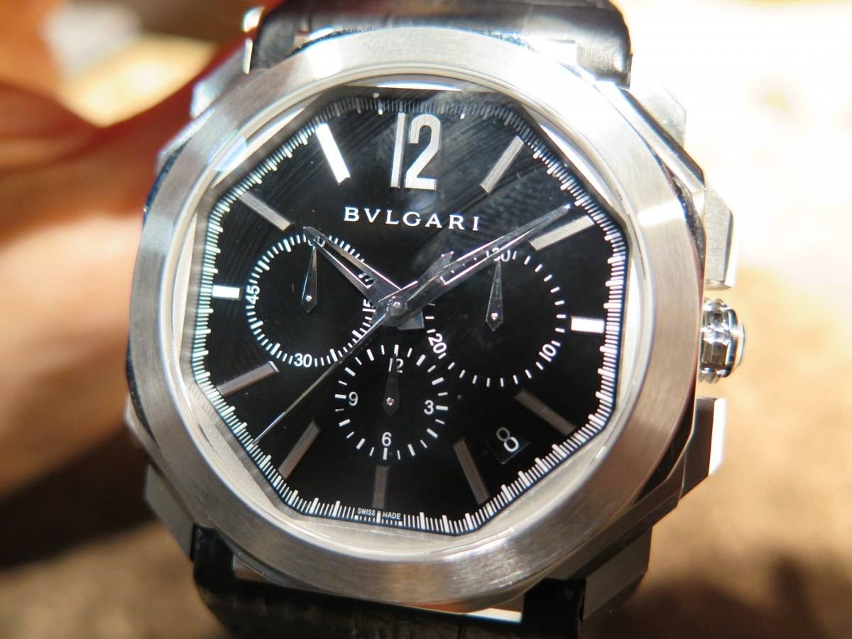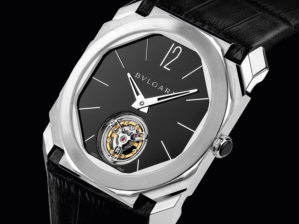 Also new in the Octo line is a new chronograph movement, the Velocissimo, a high-frequency automatic caliber (36,000 VpH), equipped with a column wheel and silicon escapement, with a 50-hour power reserve. It is cased in either 18k pink gold or steel, with a rich, black lacquered dial.