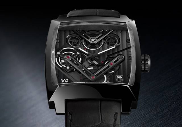 The dial is amazing to watch, with the V4 belt-driven Tourbillon at 9 o’clock and the black-coated steel bridges, each coated and hand finished with the utmost detail and design. With its black faceted hands, luminescent markers and the white TAG logo at 5 o’clock and “V4” engraving, the V4 Tourbillon dial comes to life.