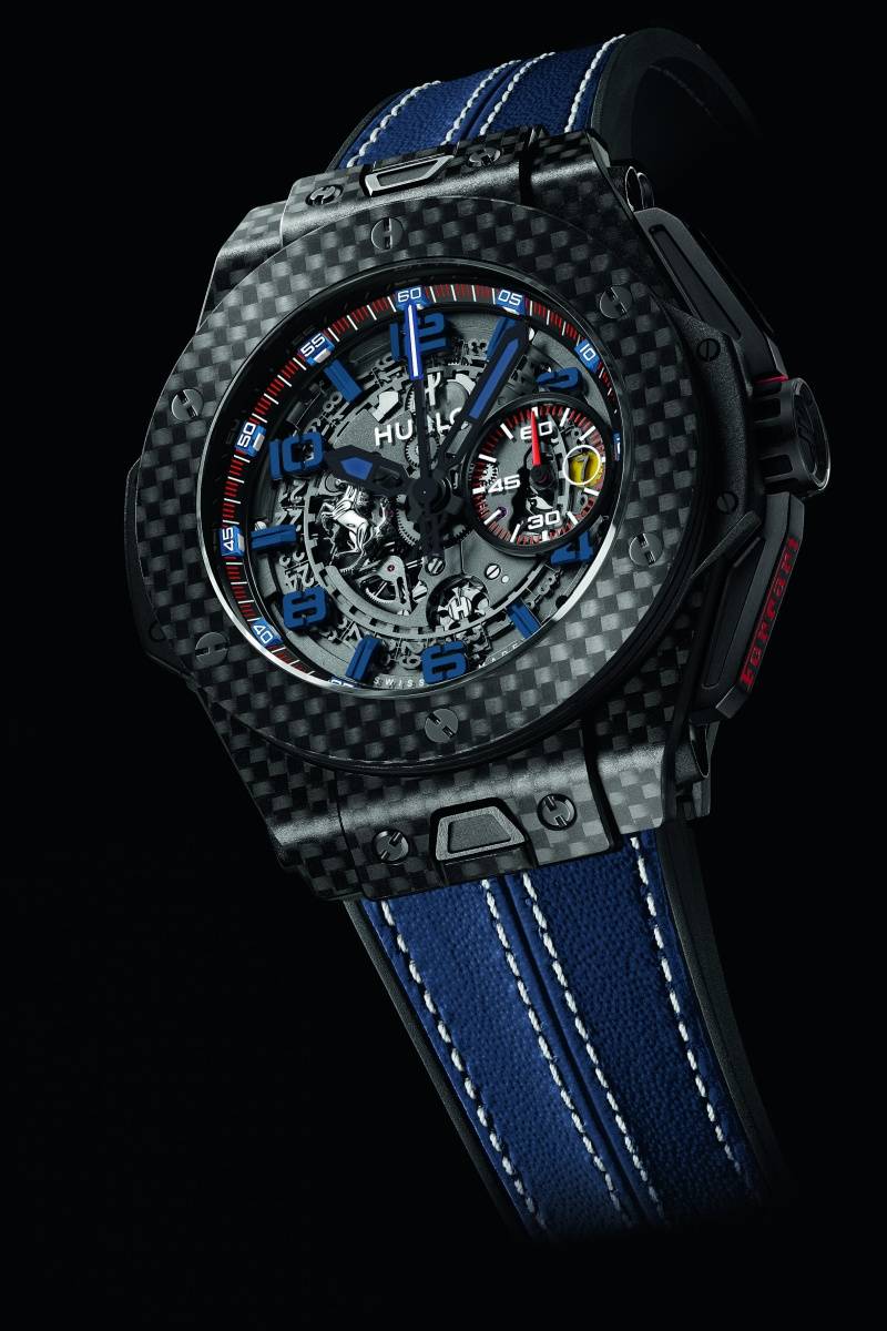 This timepiece was chosen to reflect America’s colors—red, white and blue—and features a black carbon fiber case that showcases the in-house flyback chronograph UNICO movement (can be reset at any time) visible through the sapphire dial. With just a rarity of 60 numbered timepieces available, the case back of the watch also features the discreet legendary Prancing Horse with the exclusive signature “1954-2014: Ferrari celebrates 60 Years in USA.” The UNICO movement can be compared to the best possible engine to power a racing car, and that it was selected, then designed and developed by Hublot to power the Big Bang Ferrari. With no fewer than 330 components, the column wheel and dual horizontal coupling appear on the dial. Frequency of 28’800 vibrations per hour. An indexed crown (with Hublot’s ‘H’ logo automatically positioning itself to remain in line) features elongated push buttons, fixed along a rotating axis like the pedals in a car whilst carbon inserts give the case distinctive look. Each timepiece comes with two interchangeable straps, blue Schedoni leather stitched onto black rubber, with an innovative quick-change system inspired by the safety seatbelt mechanism. The white stitching is a nod to the signature upholstery craftsmanship typical of Ferrari. 72 hours of power reserve, water resistant to 100 meters.