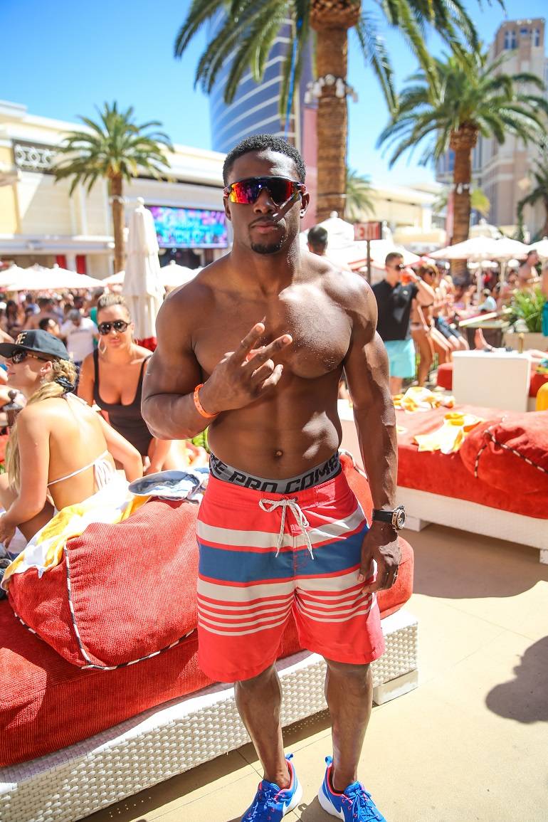 San Francisco 49ers running back Reggie Bush brought a bachelor party to Encore Beach Club at Encore Las Vegas on Saturday. Celebrating a pal’s upcoming nuptials, Bush and friends, including ESPN NFL commentator Donte Stallworth and Beyonce choreographers/dancers Les Twins, partied in high-style in a private cabana overlooking the hot pool party action.