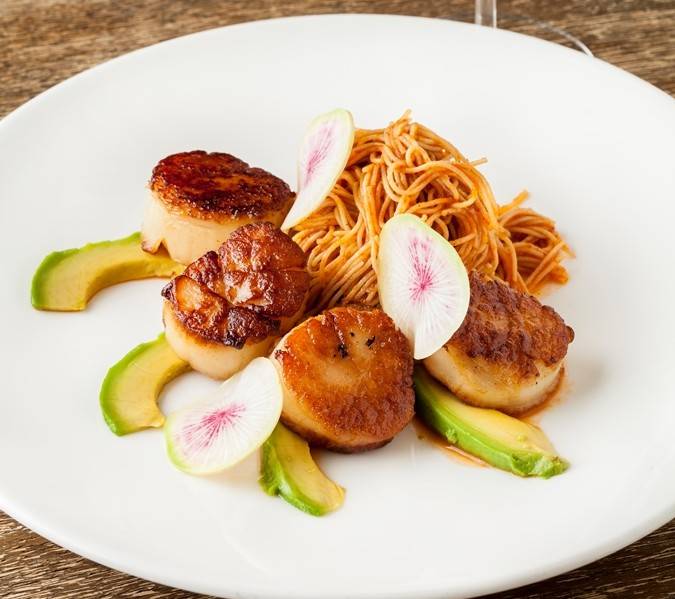Other standouts on the menu included the very citrusy Yellowtail Aguachile—Hamachi yellowtail sashimi, spicy lime broth, avocado, red onion, cucumber, Ahi Tuna Tostaditas (our favorite dish)—sushi grade yellowtail ahi tuna, chile-cumin oil, avocado, Napa cabbage, harissa aioli, pickled red onion and habanero—a fabulous tortilla soup with Pasilla tomato broth, sautéed onions, shredded chicken, avocado and tortilla strips and mouth-watering scallops served with angel hair pasta, roasted tomato chipotle sauce, avocado and shaved radish. You must not leave without trying the Passion Fruit Butter Cake: a baked-to-order confection served with grilled strawberries, passion fruit custard, coconut crumble and coconut ice cream.