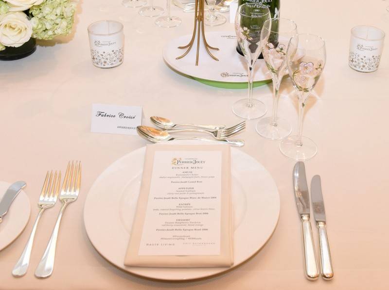 On site was Herve Deschamps, Chief Winemaker at Perrier-Jouët, who had flown over from France specially for the event. After an introduction by Eric Buterbaugh Florals co-founder Fabrice Croise—who toasted the celebratory union of flower power and supreme elegance—Deschamps took the intimate crowd of 20 VIPs and tastemakers through a menu that he had paired specially with specific vintages.