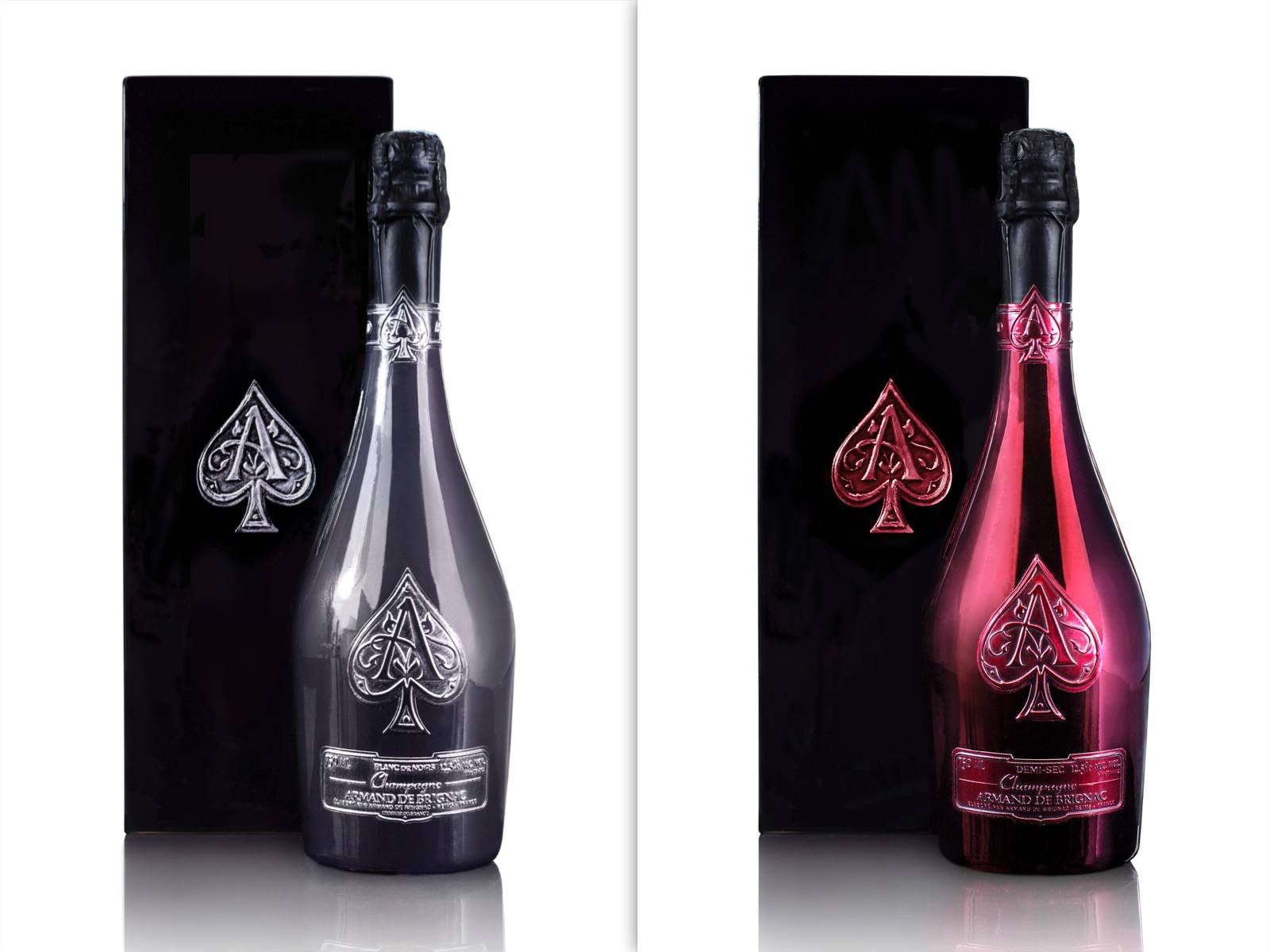 The Blanc de Noirs is presented in a luxe iconic metallized Armand de Brignac bottle, with this cuvée’s unique bottle color identifying as an almost-black shade – inspired by the black grape from which the champagne was created. Each finished bottle is hand-polished, fitted with four French pewter labels, and then placed in a premium wooden lacquered presentation box. Less than 3,000 bottles have been released globally.