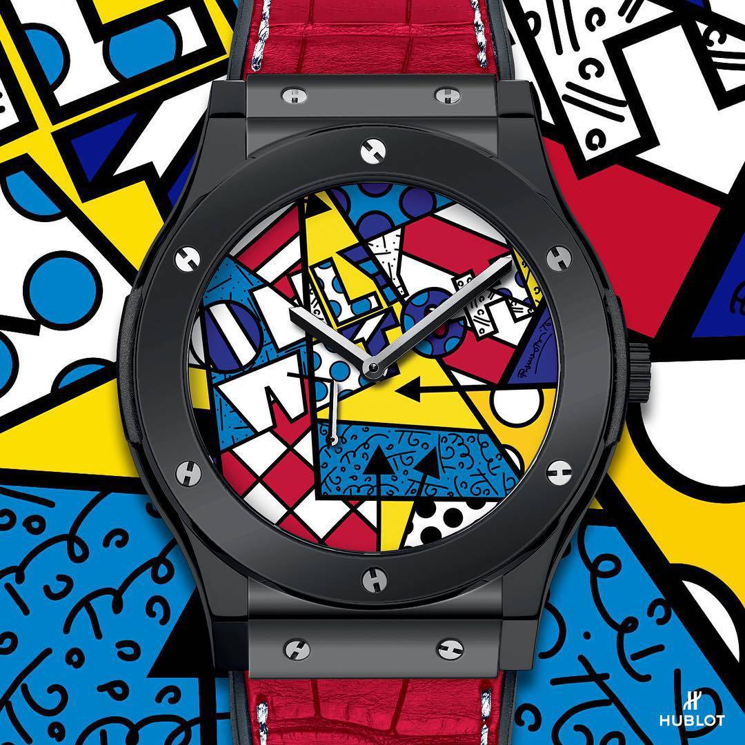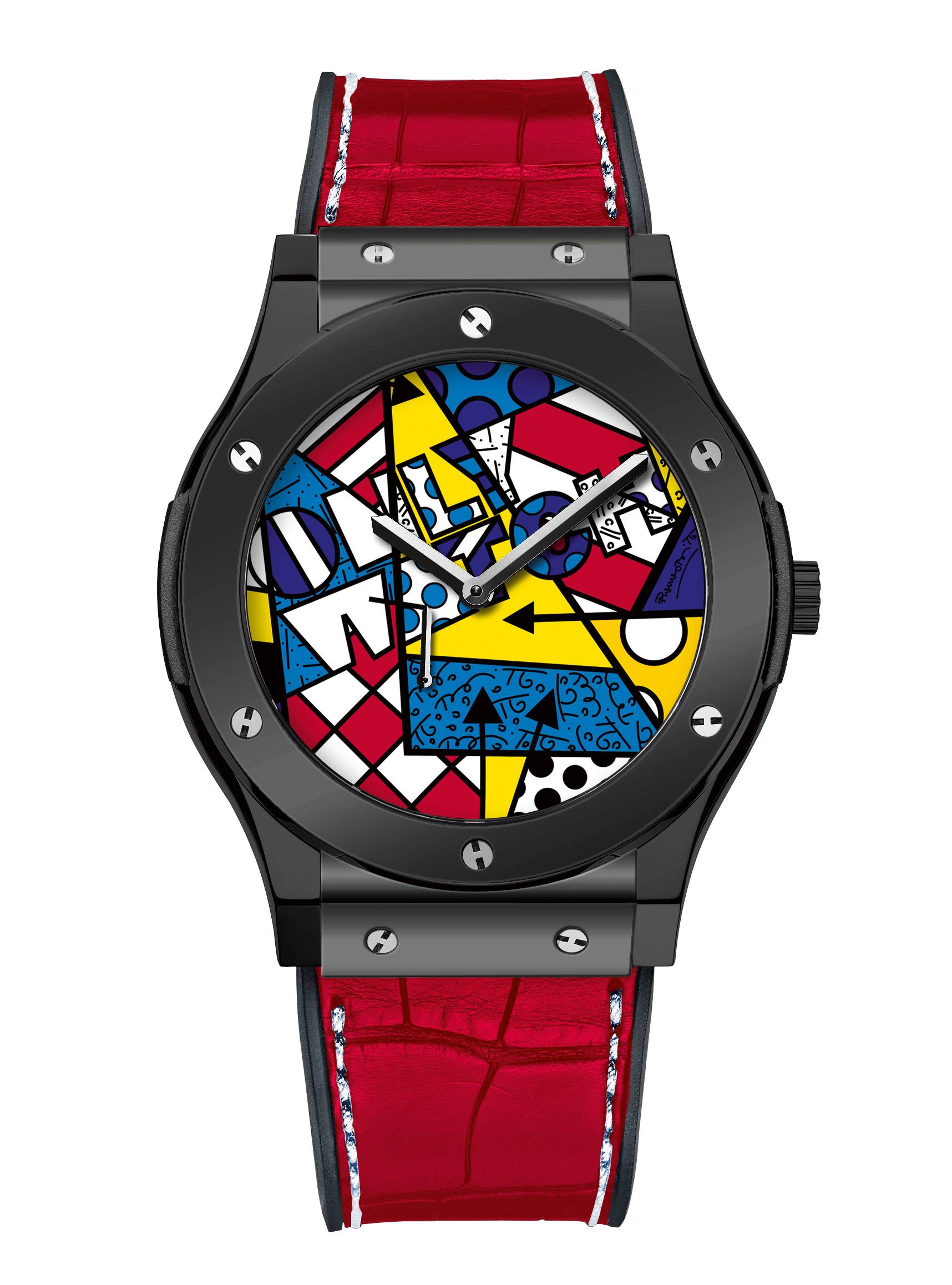 Hubot also launched two timepieces with Britto this year, the limited edition Classic Fusion Enamel Britto in platinum or ceramic and the Classic Fusion Only Watch Britto in black ceramic. Both watches combine the traditional fine art of hand enameling with the contemporary pop art and cubism style of the artist.