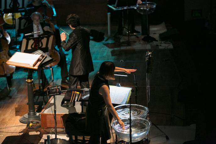 The piece asked the orchestra to wield their instruments in unusual ways. The brass section thumped the tuba and horns like percussive instruments. Wind players created squawks and whistles. As the concerto seamlessly intertwined melodic elements and dissonance, the soloist, percussionist Haruka Fujii, transformed large bowls of water into instruments, sometimes splashing a rhythm with her hands, sometimes half -immersing a gong or other metal musical devices into the water to create sounds reminiscent of nature’s more exotic reverberations.