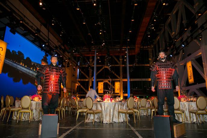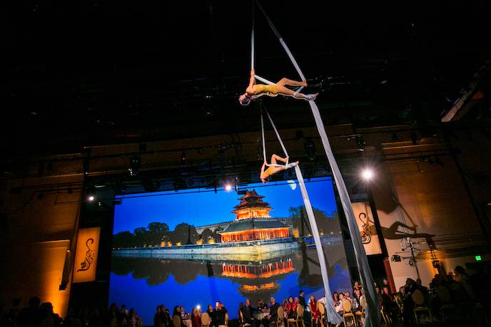 The following Imperial Dinner, held in the Zellerbach Rehearsal Hall upstairs, maintained the day’s creative spirit. Two live statues dressed as ancient Chinese warriors stood motionless as guests moved into an elegant setting anchored by illuminated wall-sized photo of ancient China. Cirque du Soleil-styled aerial performances and drawings for prizes, (everyone received a lucky number as they entered) highlighted the festivities as McCalls Catering served a six course menu designed around lucky foods: The winter melon soup embodied the blessing of “Family Unity:” The main course, seared sea bass with black bean, garlic, ginger, scallion sauce served atop sticky rice and baby bok choy, symbolized the wish of enjoying “surpluses year after year.”