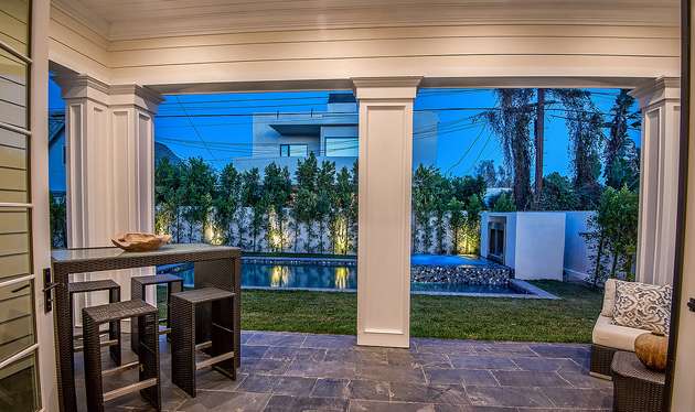 A large Caesarstone island, appliances by Sub-Zero and Wolf, and a walk-in pantry can be found in the gourmet kitchen. The master bedroom is equipped with multiple walk-in closets, his-and-her vanities, and even a refreshment bar. The two-story West Hollywood mansion also boasts a wine room with glass doors, a saltwater pool, and a spa.