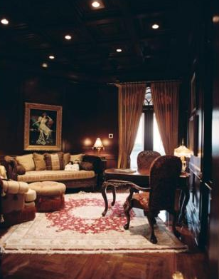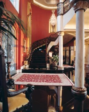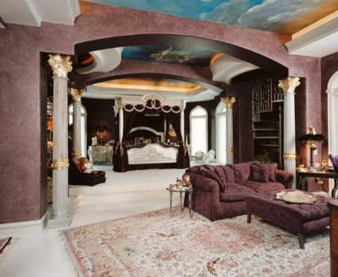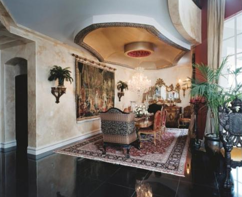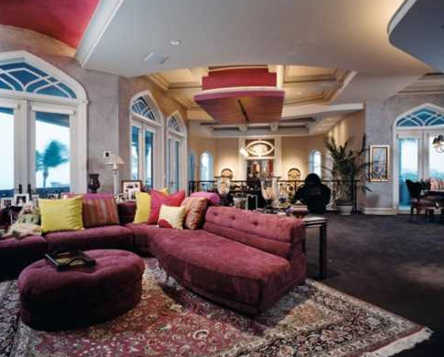 The home also features a two-bedroom staff apartment, a gourmet kitchen, movie theatre, game room, library, two elevators, a top-floor solarium and sky deck, a separate pool cabana, a pool made of Venetian glass mosaic, a wine vault, and a two-story guest quarters.