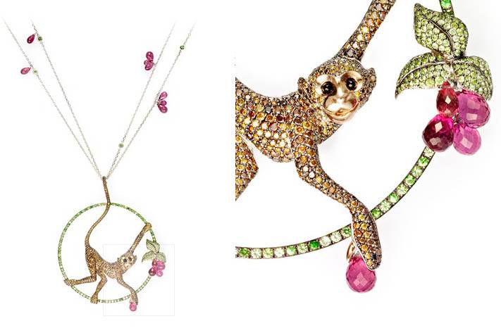 Just a few of our favorite things from this kingdom of animals? The Monkey Pendant features two curious primates, set with brown diamonds, hanging from palms and feasting on red berries. Or there is the Frog Ring in white gold set with emeralds, black and white diamonds, holding a crown featuring an outstanding brilliant-cut yellow diamond entirely surrounded by yellow diamonds. The Storks Earrings are an impressive mix of white and red gold with two briolette-cut kunzites representing the little bundle of joy. Animals have seriously never looked so good.