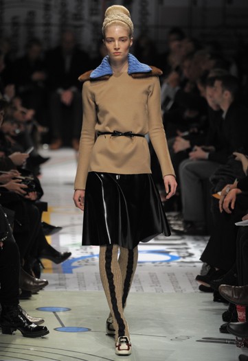 Miuccia Prada declared her latest retro inspired collection to be “very feminine” and “sexy”. Models, hair done up in sixties beehives, appeared wearing womanly wide-skirted dresses, the bust becoming the new focal point of the silhouette. It was a much more sensual yet still classic side of Prada from its plain black long sleeved, knee-length, hem-ruffled wool dresses, to the high-gloss vinyl skirts, chunky cable knits and detailed jackets & coats. Prada this fall has been designed for the real, curvaceous woman in mind and it was entirely strong and refreshing.