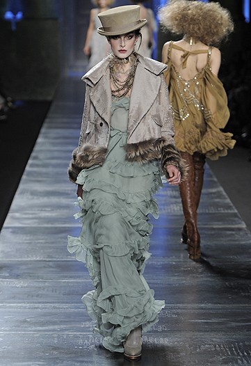 Not quite finished with the equestrian theme he explored for Dior’s couture, John Galliano picked up where he left off in January in English riding country, this time with the words and lifestyle of an 18th-century libertine poet in mind: “Since ’tis nature’s law to change, constancy alone is strange.” Galliano was in his element, plundering the wardrobe of the debauched aristocrat and bawdy poet, complete with hats designed by London’s Stephen Jones. He layered pretty, playful pieces, such as silk blouses, fur vests, cavalry jackets & waistcoats and riding pants with ruffled dresses, which felt both romantic and retro. The French Minister of Finance, Christine Lagarde, and the actress, Charlize Thereon, were among the front-row line-up applauding as Galliano’s “little libertines” made the final catwalk parade.