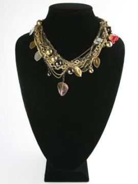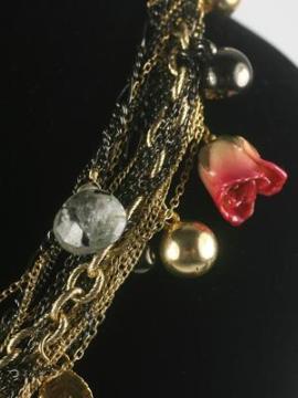 Her collections include artistically innovative necklaces, bracelets, hairpieces, pins, bangles, and earrings that range from her signature floral pieces (made of real flowers like orchids, pansies, roses, leaves that have been preserved and covered in lacquer, gold, and/or silver), to multi-layered chain necklaces, charged crystals (that are charged with special electromagnetic energy which improves circulation in your body), and real elements from the ocean like gold-covered preserved seahorses, shells, and coral.