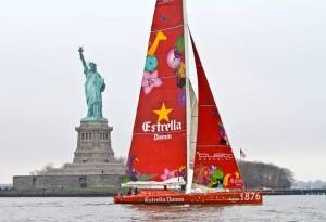 Custo designed the sails for the Estrella Damm regatta boat, which will be competing with the W Hotel sails for the world record. His design is playful, uplifting and energizing. On a basis of red, a yellow outline of a giraffe, pink orchids, butterflies and more accent the Estrella Damm sails. The boats will set sail from New York harbor with Barcelona as the destination.