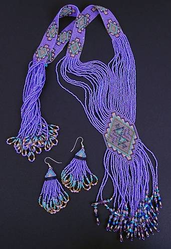 This delightful set featuring a purple beaded necklace and delicate earrings by Wendy Weston is an elegant example of traditional Navajo beadwork. The necklace measures 25 inches long, minus the pendant, and would make a bold addition to any bright summer outfit. Wear the items together or separate.