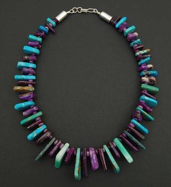 An absolute showstopper, Tommy Jackson’s 22-inch sugilite and turquoise necklace with sterling silver caps and clasps reminds one of the colors of the sky just after a Southwest sunset. Jackson, from Ganada, Arizona, is a contemporary Navajo jeweler who learned traditional jewelry making techniques from his father and now creates wearable works of art.