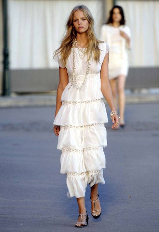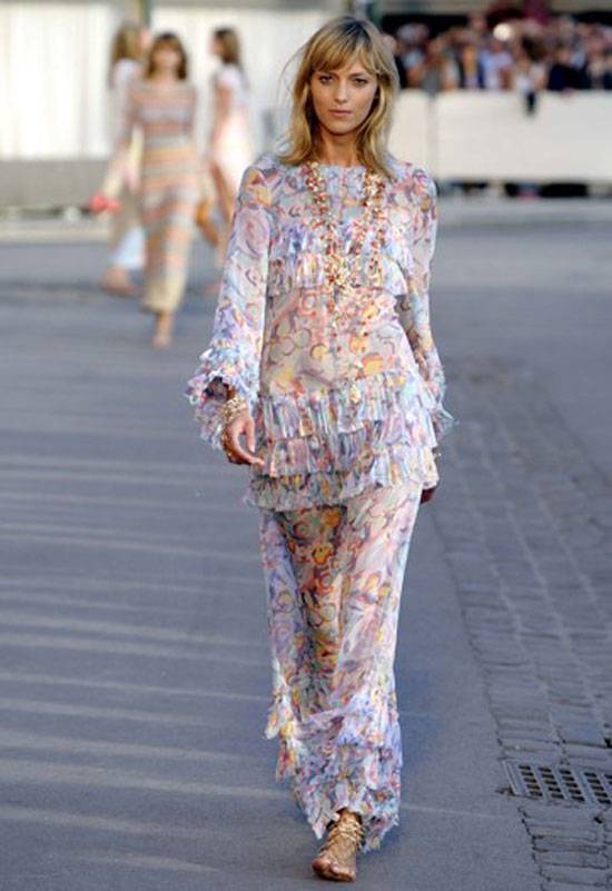 But what of the Cruise show? Lagerfeld—who says, “Saint-Tropez is about freedom—dress code included”—sent models down the runway in diaphanous print chiffon dresses and bare feet. What followed was a steady stream of 60s and 70s-inspired looks; CC-logoed bell bottoms, chemise dresses, wide-leg pants, tubular dresses, lots of white cotton accessorized with lovely Chanel jewelry, long sundresses with tiered skirts, and, of course, the requisite Chanel tweed.