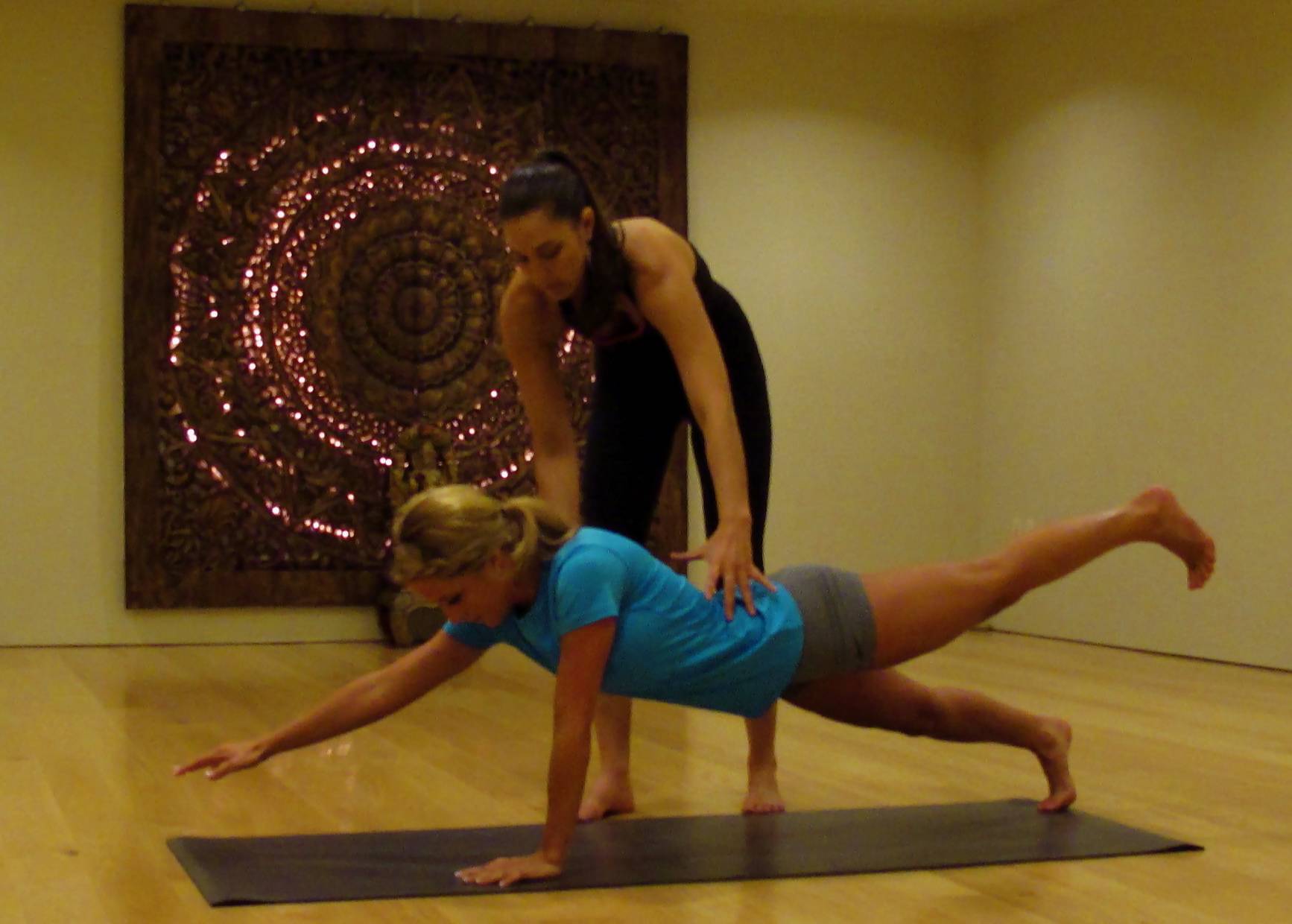 2. Firm your belly and firm your quadriceps. Make sure your spine is in one long line paying attention not to sag or arch the low back.