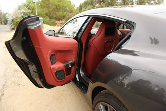 Visually, the Rapide is as arresting as any recent Aston model. With its pillarless intersection of front and rear windows, the car possesses the outward physical spatial geometry of the brand’s coupes, and indeed can easily be mistaken for a coupe at a mere glance from certain angles. The rear doors are in themselves works of sculpture whose trailing edges curve up into the rear fender’s haunches. All doors open at a gentle upward 12-degree angle in a design that Aston is calling “swan wing” doors. Fit and finish are typically fantastic, and though our test car was trimmed in Quantum Silver over a Chancellor Red leather interior, Aston says that between paint, interior and feature options, the Rapide can be customized upon order to the tune of over 2.5 million combinations.