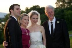From left, Marc Mezvinsky, U.S. Secretary of State Hillary Clinton, Chelsea Clinton and former U.S. President Bill Clinton pose during the wedding of Chelsea Clinton and Marc Mezvinsky at the Astor Courts Estate on July 31, 2010, in Rhinebeck, N.Y. Chelsea Clinton, the daughter of former U.S. President Bill Clinton and Secretary of State Hillary Clinton, married Marc Mezvinsky today in an interfaith ceremony at the estate built by John Jacob Astor on the Hudson River about two hours north of New York City. (Handout photo by Barbara Kinney/Matt McKenna via Getty Images)