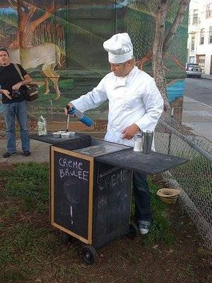 For an updated location on the crème brûlée man’s whereabouts, follow him on Twitter at www.twitter.com/cremebruleecart.