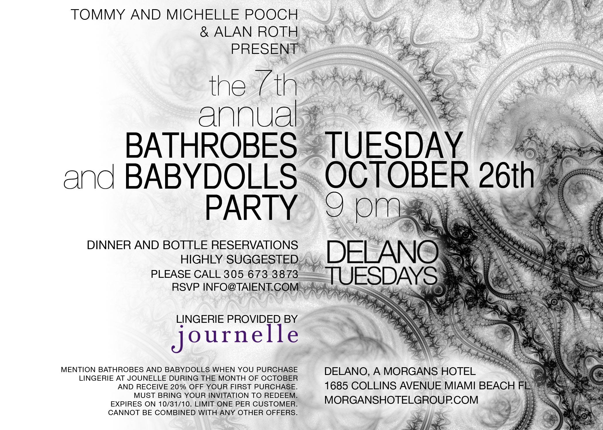 Miami Beach’s most sought-after Tuesday night party just got a whole lot sexier with the seventh annual Bathrobes and Babydolls party Tuesday, October 26 at 9 p.m. at Rose Bar at The Delano. Tommy Pooch, Alan Roth and Journelle lingerie invite South Beach’s ladies to don their favorite babydoll and encourage men to channel their inner Hugh Hefner for a night of dancing, drinks and debauchery. Start the night at Blue Door and Rose Bar for dinner and drinks while listening to the sounds of DJ Irie and Artist Related’s Mr. Sandman.
