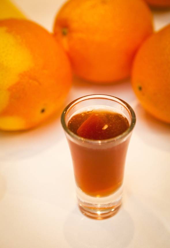 Combine ingredients in a tin. Shake and strain into a shot glass. Garnish with the thin zest of an orange.