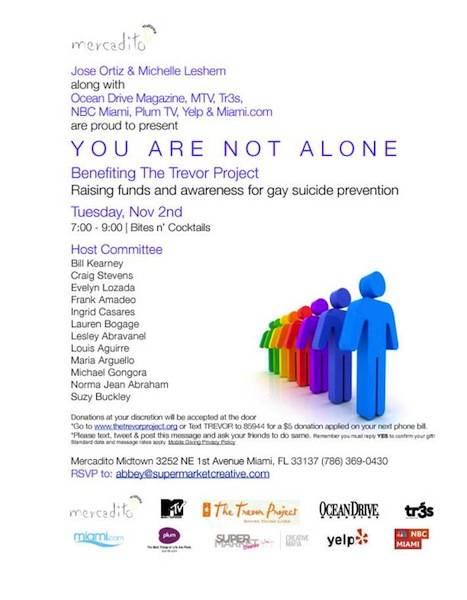 On Nov. 2, Mercadito Miami and Miami’s Luminaries will host a very special evening called You are Not Alone with a cocktail party in support of The Trevor Project. The Trevor Project is the leading national organization focused on crisis and suicide prevention efforts among the LGBT community.