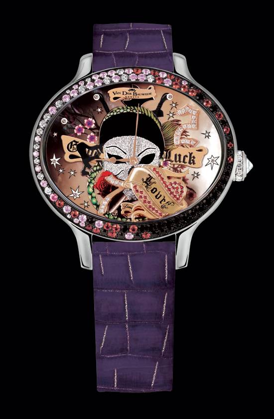 Each Van Der Bauwede Genève watch has been created unique in itself, and the Good Luck Watch, which retails for $9,900, is no exception. Powerful and enchanting, the watch complements Pink’s vibrant lifestyle. A case set in precious stones in subtly graded shades surrounds a femine and enigmatic dial. The diamond-dusted dial echoes a dramatic “Moulin Rouge” world, juxtaposed with an adventurous “Jack Sparrow” mood. The mother-of-pearl embellishment and floral motifs lend a feminine mystique to a dial stage-setting, enlivened by tattoo-like print and a gem-set heart.