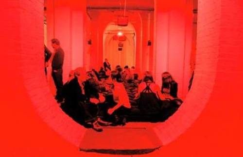 The opening night crowd also took a break from the exhibits to sprawl and talk on a giant black, cross-shaped bed in the red-lit crypt of this former church.