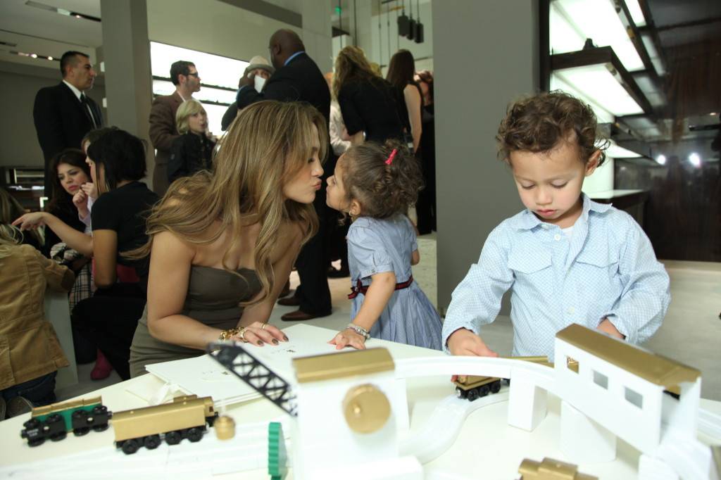 Lopez showed up in a simple, short, chocolate-colored strapless dress from Gucci’s Cruise 2011 collection with khaki green caged-pumps and Gucci 18-karat gold bracelets. She eventually changed into something a slightly more comfortable – a black jersey jumpsuit with gold details from Gucci’s Spring/Summer 2011 collection with a black leather and gold metal belt and a Gucci black suede sandals and a python clutch. Her other accessories? Her children, of course! Max and Emme also showed up dressed to the nines in Gucci. Emme wore a white and navy striped dress with red bow, while Max wore a light blue cotton Gucci “GG” print shirt and white pants. Lopez and her children also star in the new ad campaign for the launch of the collection.
