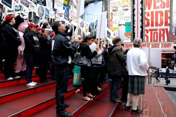 Times Square New Year’s Eve, MasterCard Worldwide and Times Square Alliance kicked off their fund-raising initiative for Stand Up To Cancer, Tuesday afternoon. New York City stars including Tony Award-winning actor Denis O’Hare, actress Montego Glover and actor Chad Kimball joined in to encourage New Yorkers to help out. Through New Year’s Day, each time you use a MasterCard at one of the 70 participating Times Square businesses, MasterCard will donate $1 to Stand Up To Cancer. You can view a full list of participating businesses at timessquarenyc.org.