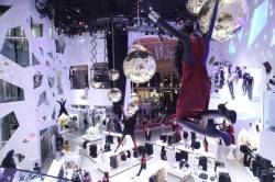 Guests walked into a store with disco balls hanging from the 50-foot atrium and custom-designed walls with changing light shows. Mannequins hung from the ceiling and dotted seating areas.