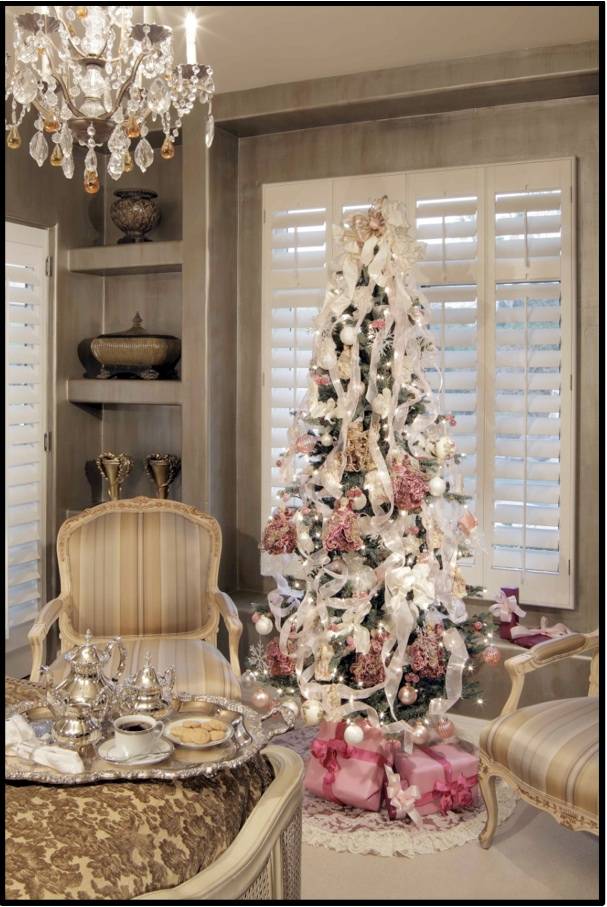 “Christmas decorating is about the ambiance, so don’t forget to add lots of items that dazzle and sparkle. Instead of adding tinsel or an abundance of lights, try hanging jewels and strings of crystal beads. This will provide filler between branches and give your tree that extra ‘oomph’ to leave a lasting impression.