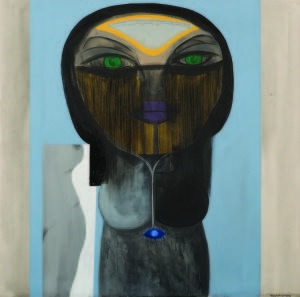 Such a practice is most evident in Salman’s acclaimed “Fashion Series” which features provocatively dressed women in seductive poses. His latest works continue to play with depictions of what might be considered socially acceptable, the women in these works are nevertheless more robust in form as they pose against sparsely colored backgrounds. They profess their vanity in narcissistic stances as if trying to win approval from some hidden audience. Alone they are in their performance although quite appealing in their eager desire for admiring onlookers.