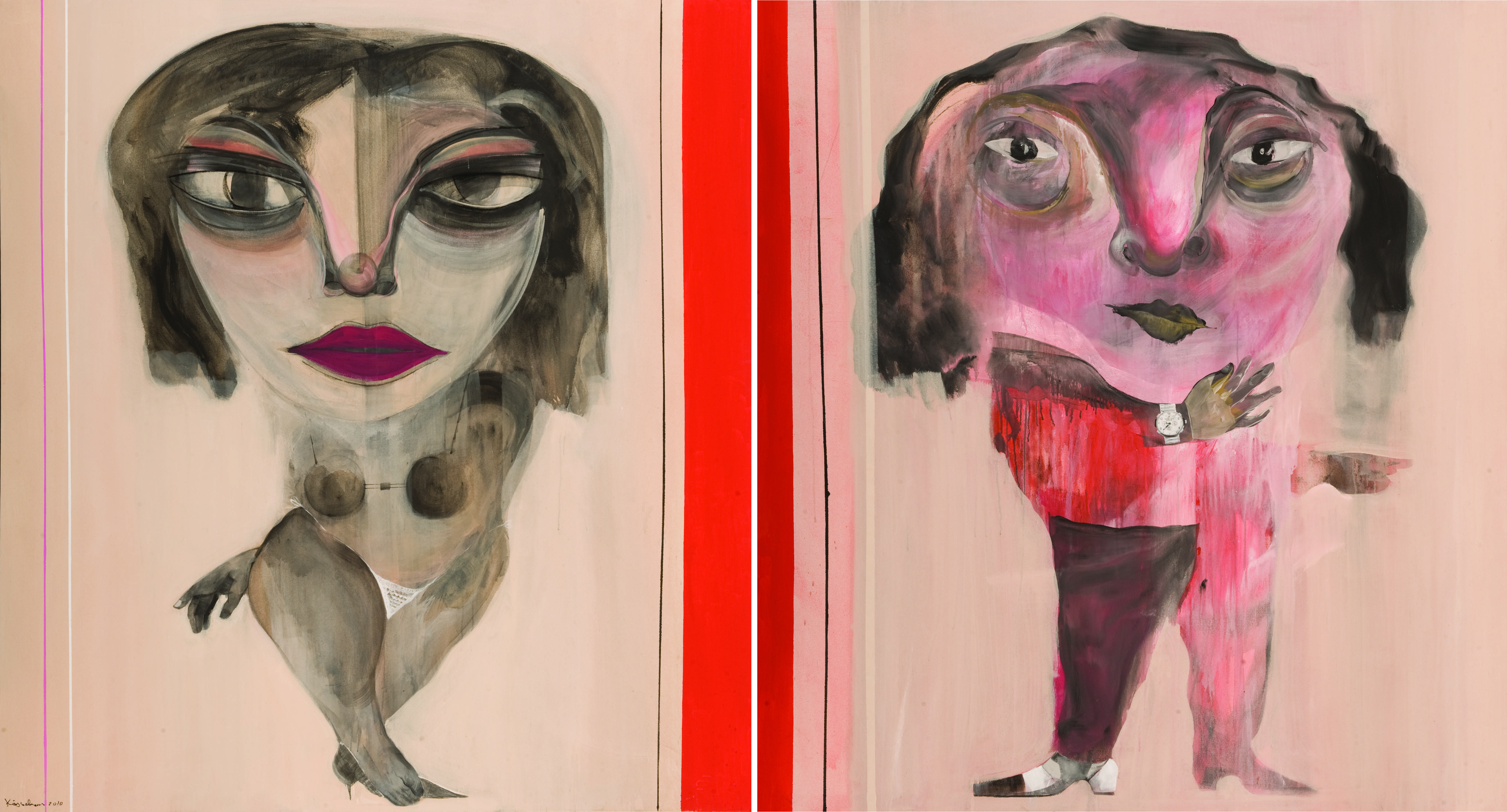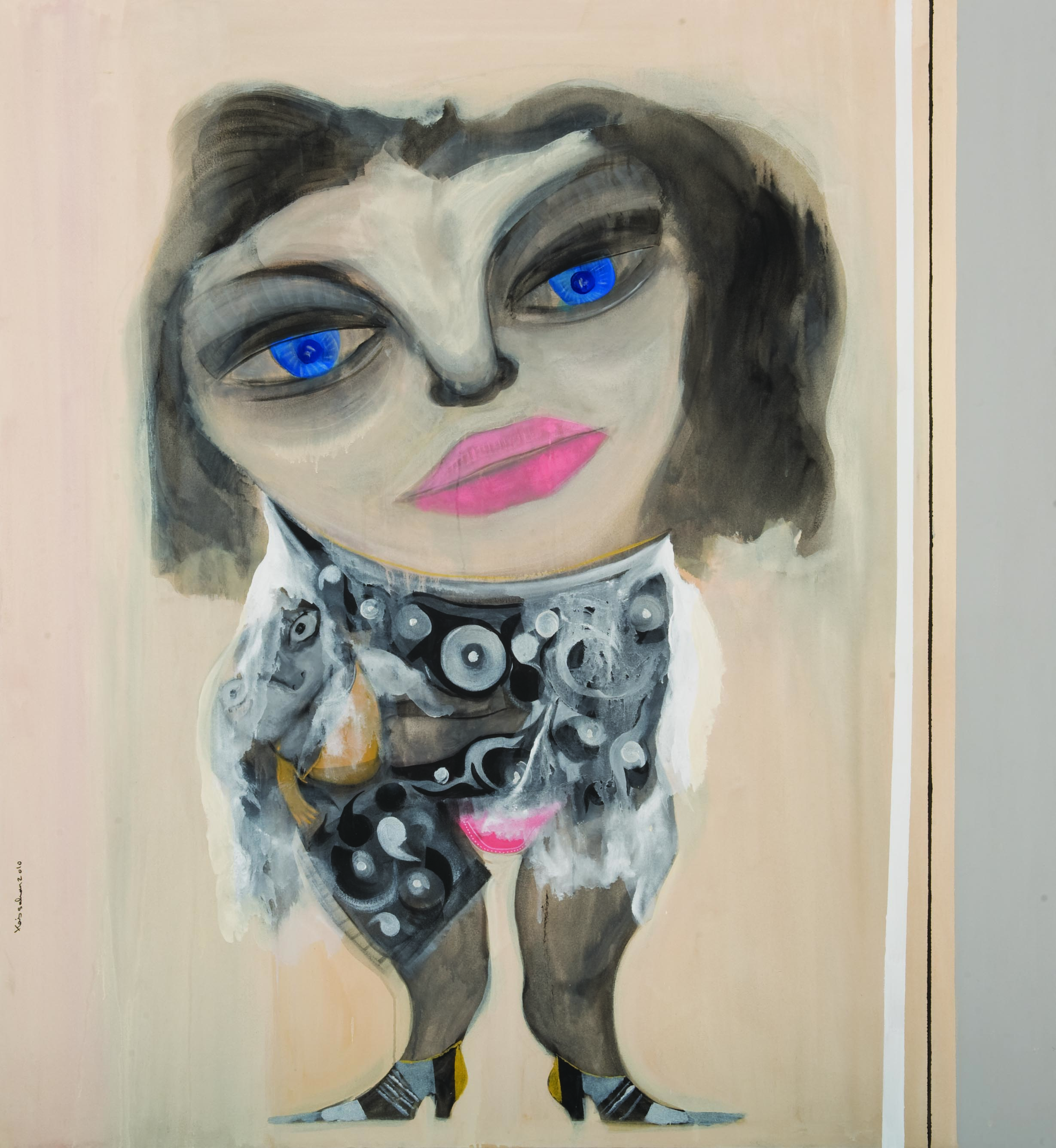 Such a practice is most evident in Salman’s acclaimed “Fashion Series” which features provocatively dressed women in seductive poses. His latest works continue to play with depictions of what might be considered socially acceptable, the women in these works are nevertheless more robust in form as they pose against sparsely colored backgrounds. They profess their vanity in narcissistic stances as if trying to win approval from some hidden audience. Alone they are in their performance although quite appealing in their eager desire for admiring onlookers.