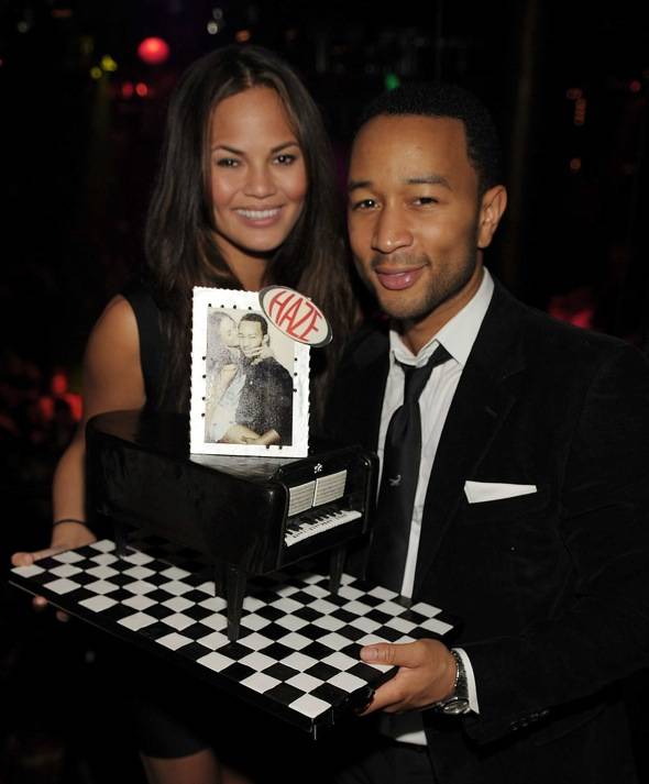 Following the performance, Legend and girlfriend/supermodel Christine Teigen and guests headed to their VIP section where Legend was presented with a customized birthday cake in the shape of a piano, topped with an adoring picture of the couple. As Legend posed for pictures with his cake, Teigen gave him birthday kisses before the loving couple danced the night away to the sounds of Haze’s resident deejay.