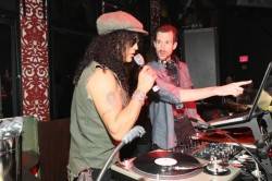 Slash and the group, including Laura Croft from “Holly’s World,” arrived upstairs in the club to great fanfare, taking over several tables on the dance floor as fans crowded to get pictures. He joined DJ Ross One in the deejay booth, announcing to the crowd that he was going to play make shift deejay and, “and interrupt your regular programming for an hour or so.” Slash started off his set with “Sweet Child O’ Mine,” “Welcome to the Jungle” and “Crazy Train,” setting the stage for the perfect night. After getting the party started, Slash returned to his table to watch the crowd enjoy his specially selected play list.