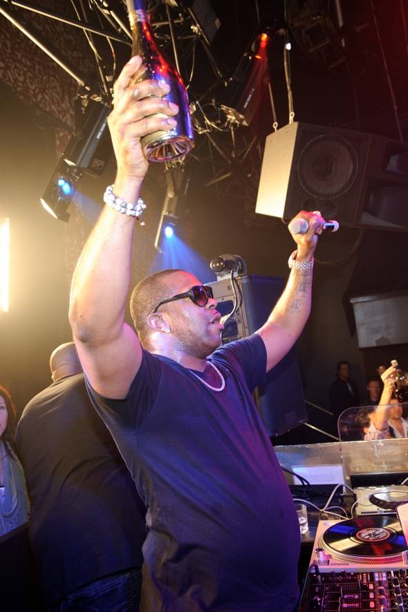 He grabbed the mic, telling the crowd he was, “In the mood to do a couple of classics,” surprising the packed club with an impromptu performance of favorites including “All I Do Is Win,” “Pass the Courvoisier” and “Arab Money.” Wrapping up he told the crowd, “This is the time where we make a toast,” and then headed back to his Sky Box stocked with Moet Nectar Rose and Patron.