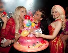 Once inside, the “PeepShow” entourage was seated at the best table in the club, directly on the dance floor looking out on the venue’s 90-foot waterfall. Madison wasted no time to get the party started, as she jumped up on top of their banquette, dancing with her friends, waving and posing for fans’ photo requests from below. The group was especially excited to hear Katy Perry’s “Firework” and Afrojack’s “Take Over Control,” screaming in excitement and singing along to every word with each other. She was also overjoyed to see the staff were all dressed in her honor, donning tube socks, short shorts, I Love Holly T-shirts and even her signature candy necklaces from Sugar Factory. She tweeted a photo out to saying, “The cocktail girls at Tryst are all in Holly costumes!! So cute!”
