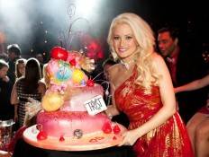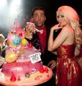 The staff at Tryst presented Madison with an immaculate Valentine’s Day cake, a three-tier creation by Freed’s Bakery in Las Vegas. Each layer was a giant stacked candy heart with oversized Valentine’s Day candy and cherries topping it. After taking photos, Madison stuck her finger in it to lick the frosting and once Strickland and Porrino realized the cake was real, they ripped out a middle section to take a bite of the holiday delight.