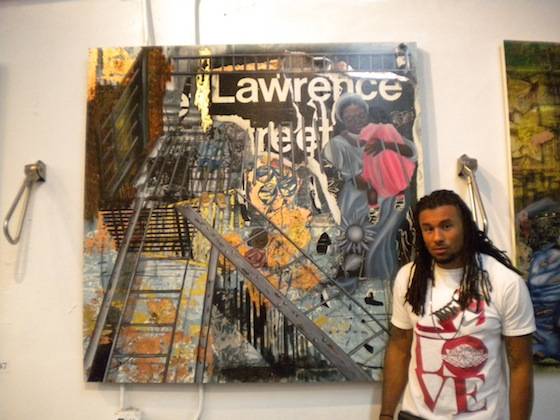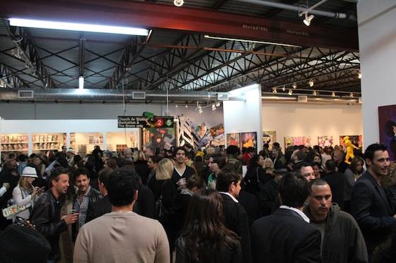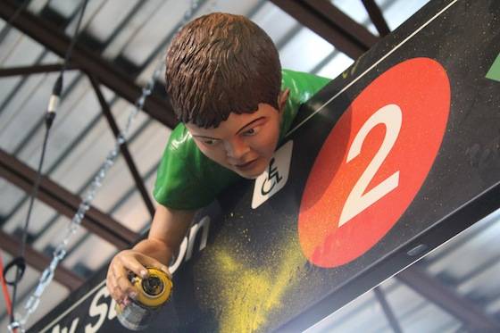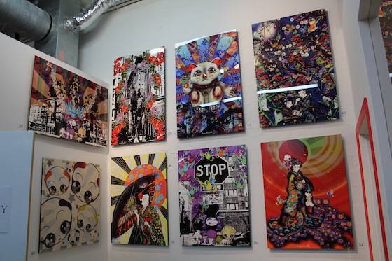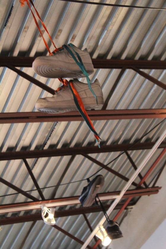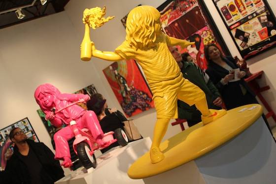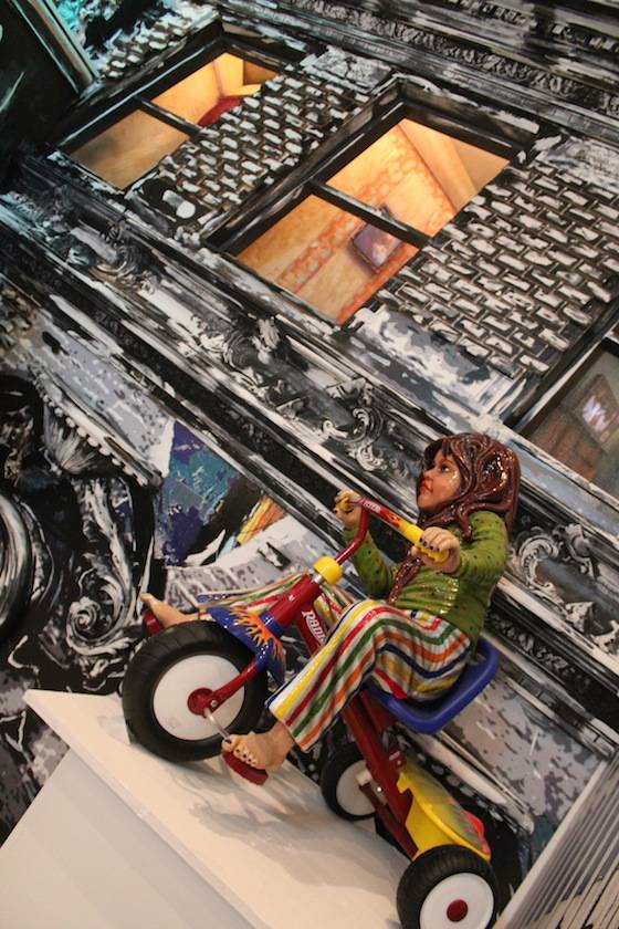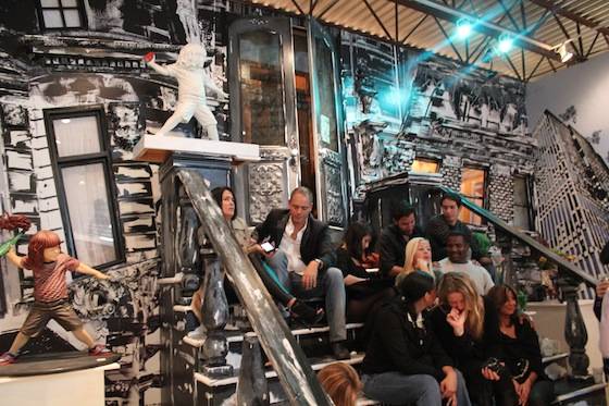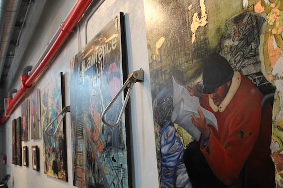 Miguel Paredes’ art combines bold colors, 3D elements, graphic prints, and unique characters to create eye-catching whimsical pieces. As a New York native, Paredes also pays homage to his beloved city via his artistic creations. Works throughout the gallery featured subway signs and rails, graffiti, metallic garbage cans, and mischievous street children. One piece even highlighted New York’s famous Gray’s Papaya Hotdogs. The VIP area was held inside Paredes’ Brownstown Lounge, an intricately crafted, 3D mural-wrapped room. Local interior designer and 3D specialist Jeff Vaughn, as well as Broadway designer and producer Antonio Marion, collaborated on the impressive lounge space. The room is a tribute to the street and building Paredes grew up in; here he pays particular attention to the sights and textures of a New York City Brownstone neighborhood. The windows give sight to life-like rooms with antique televisions and walls covered in aged wallpaper. Look up, and sets of laced sneakers hang from the galleries ceilings while guests sit on the Brownstone’s stoop. The space wonderfully succeeds in transporting its guests into another time and space.