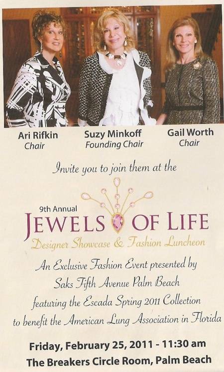 This Friday, Feb. 25, 2011 at 11:30 a.m. Ari Rifkin, Suzy Minkoff, and Gail Worth invite you to join them at the 9th Annual Jewels of Life Designer Showcase & Fashion Luncheon to benefit the American Lung Association in Florida.