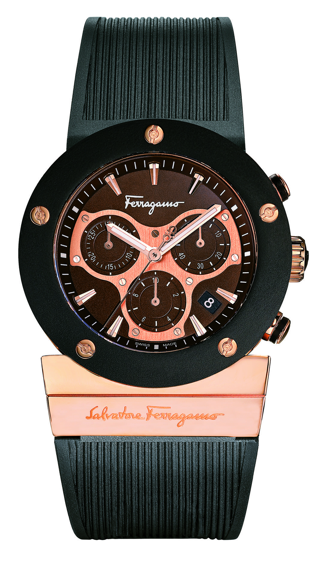 Salvatorre Feragamo Black Watch with Rose Gold Face, available at www.ferragamo.com