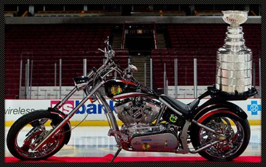 Gibsons Bar & Steakhouse in downtown Chicago will host the 2010 Stanley Cup Champion Chicago Blackhawks Chopper on Thursday, March 24. Chicagoans will have a chance to purchase raffle tickets for this custom bike built by Paul Teutul Sr. of Orange County Choppers during the event. Scheduled to appear is NHL Legend Jeremy Roenick; the first fifty individuals who purchase raffle tickets will receive an autographed picture of Jeremy Roenick. The Blackhawks logo is displayed on the gas tank, which is autographed by players and coaches of the Stanley Cup Championship team. The bike’s rims emulate hockey sticks and pucks and the handlebars depict the taped end of a hockey stick.
