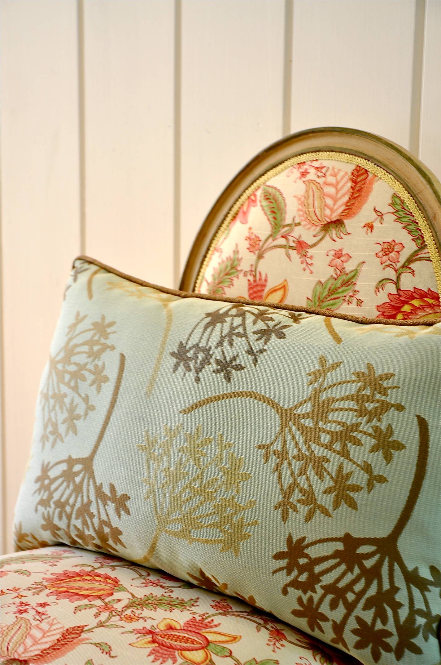 Standard pillow sizes are 22 x 22 inches and start at $125. The sumptuous Fortuny silk box pillow I tried to stuff in my purse was $250. She also works with Sunbrella and other exterior fabric for outdoor furniture.