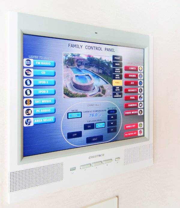They also were able to do the daunting task of creating a clean aesthetic to the room by cleverly hiding all the equipment and cables from sight. The Runco DLP projector, as well as the subwoofers and speakers, were all hidden to help ensure the room looked clutter-free. The anamorphic 107-inch Stewart Filmscreen display helps hide most of it. Intended for easy control, the homeowners wanted to be able to control everything with just the press of one button. Using a touchpanel, the owners are able to cue up the movie, switch between lighting effects and adjust the temperature. And it all can be turned off with the SYSTEM OFF button and everything, including the talking robots and light fixture will shut down.
