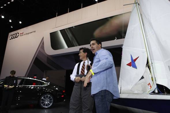 Audi’s press conference at this week’s New York Auto Show received some unexpected comic relief with an appearance by Stephen Colbert. The dry-witted political humorist, seen above at left with fellow funnyman and car guy Adam Carolla, joined Audi of America president Johan de Nysschen to announce Audi’s entry into the 2011 Charleston Bermuda Race, a biennial yachting competition to be held on May 21. Now in its 16th running, the challenging ocean race sets sail from Charleston, SC en route to Bermuda, with part of the course navigating around the notorious Bermuda Triangle.